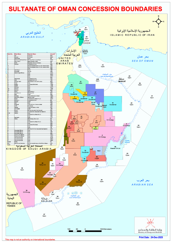 Explore the detailed concession boundaries within the Sultanate of Oman, as illustrated in the map below. This map provides a comprehensive view of the various concession blocks, operators, and their respective areas. It is a vital resource for understanding the distribution of oil and gas concessions across the country. The map highlights the strategic regions allocated for exploration and production activities. For a more detailed view, you can download the full PDF version of this map using the link provided.